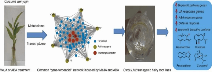 课题组继2024年1月发表” Integrative omic and transgenic analyses reveal methyl jasmonate- and abscisic acid-responsive regulator CwbHLH2 that positively regulates terpenoid biosynthesis in Curcuma wenyujin” (IND CROP PROD, 中科院大类一区,IF=5.9)(论文1),发现JA和ABA双向核心调控因子CwbHLH2正向调控了温郁金萜类成分的生物合成,过表达CwbHLH2基因大大提升了Curcumol、Curdione、Germacrone、Furanodiene、β-Elemene等药效成分的含量。近日(4月28日),课题组又在权威期刊PLANT CELL ENVIRON(中科院大类生物一区,IF=7.3),发表”CwJAZ4/9 negatively regulates jasmonate-mediated biosynthesis of terpenoids through interacting with CwMYC2 and confers salt tolerance in Curcuma wenyujin“研究论文(论文2),揭示了CwJAZ4/9通过与CwMYC2相互作用负调控茉莉酸介导的萜类(curcumol, furanodiene,β-elemene等高价值药效成分)生物合成并赋予其耐盐性。上述发现将为下一步培育高品质、高药效温郁金中药以及利用代谢工程手段异源宿主生产高价值药效成分提供了依据。未来,课题组将在上述研究基础上,继续开展温郁金全基因组测序,完整描绘其进化机制,科学揭示温郁金”道“而优的科学内涵,全过程重构高价值药效成分的合成通路,持续为开发温郁金”中国药“贡献方案。