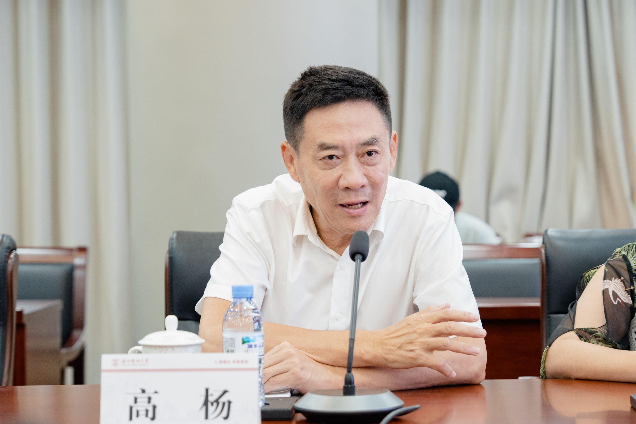 吕一军代表楼凤 热烈欢迎温州海鹤药业有限公司高杨董事长一行的来访,对高杨董事长关心与支持我校教育事业的发展,用实际行动诠释对教育的热爱与社会责任表示最衷心的感谢和最崇高的敬意。他表示,希望双方以此次合作为契机,发挥自身优势,共同探索产教融合的人才培养新模式,合作开展创新科研项目,实现互利共赢,进一步推动校企合作的新起点,为药企提供人才培养和科技创新的平台,推动中医药事业的可持续发展。