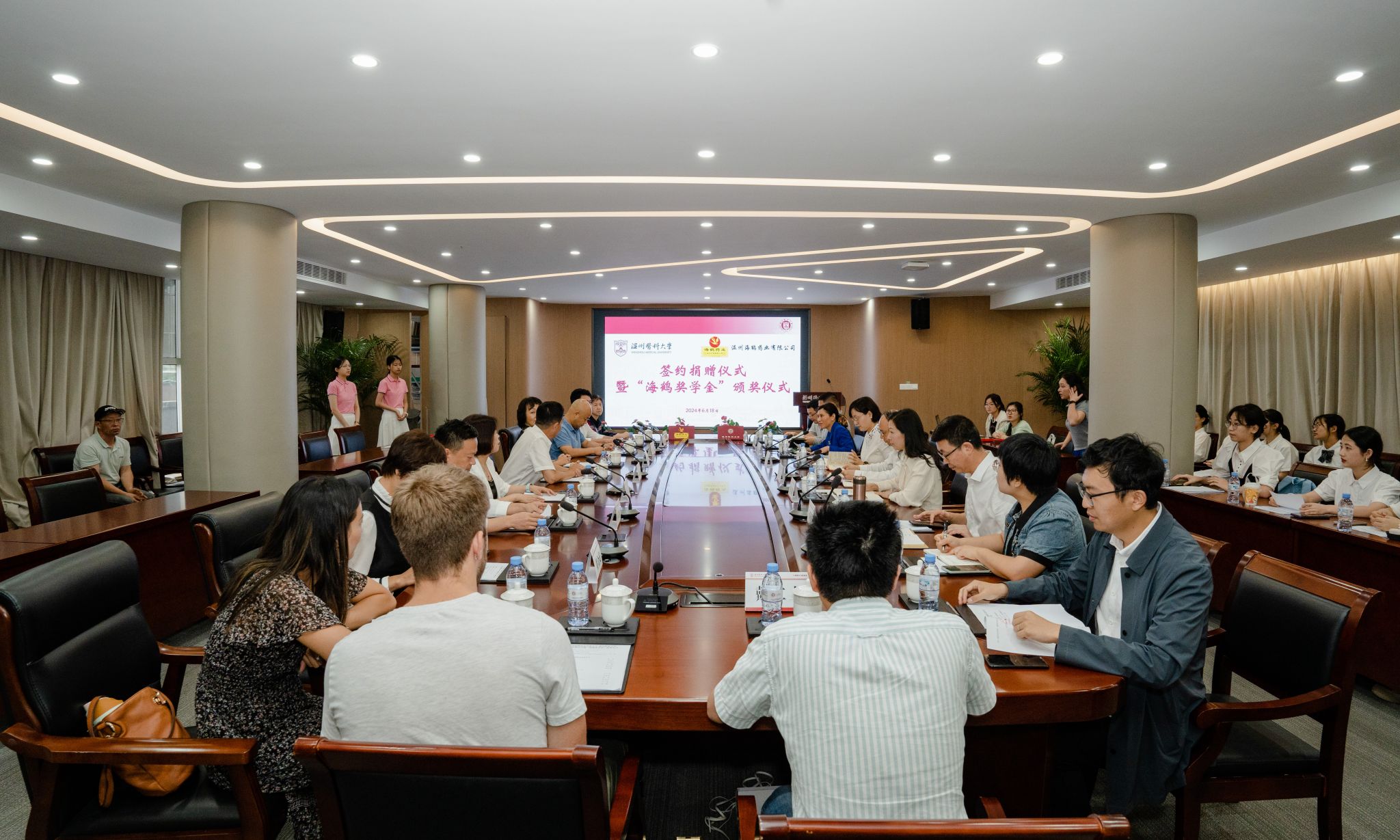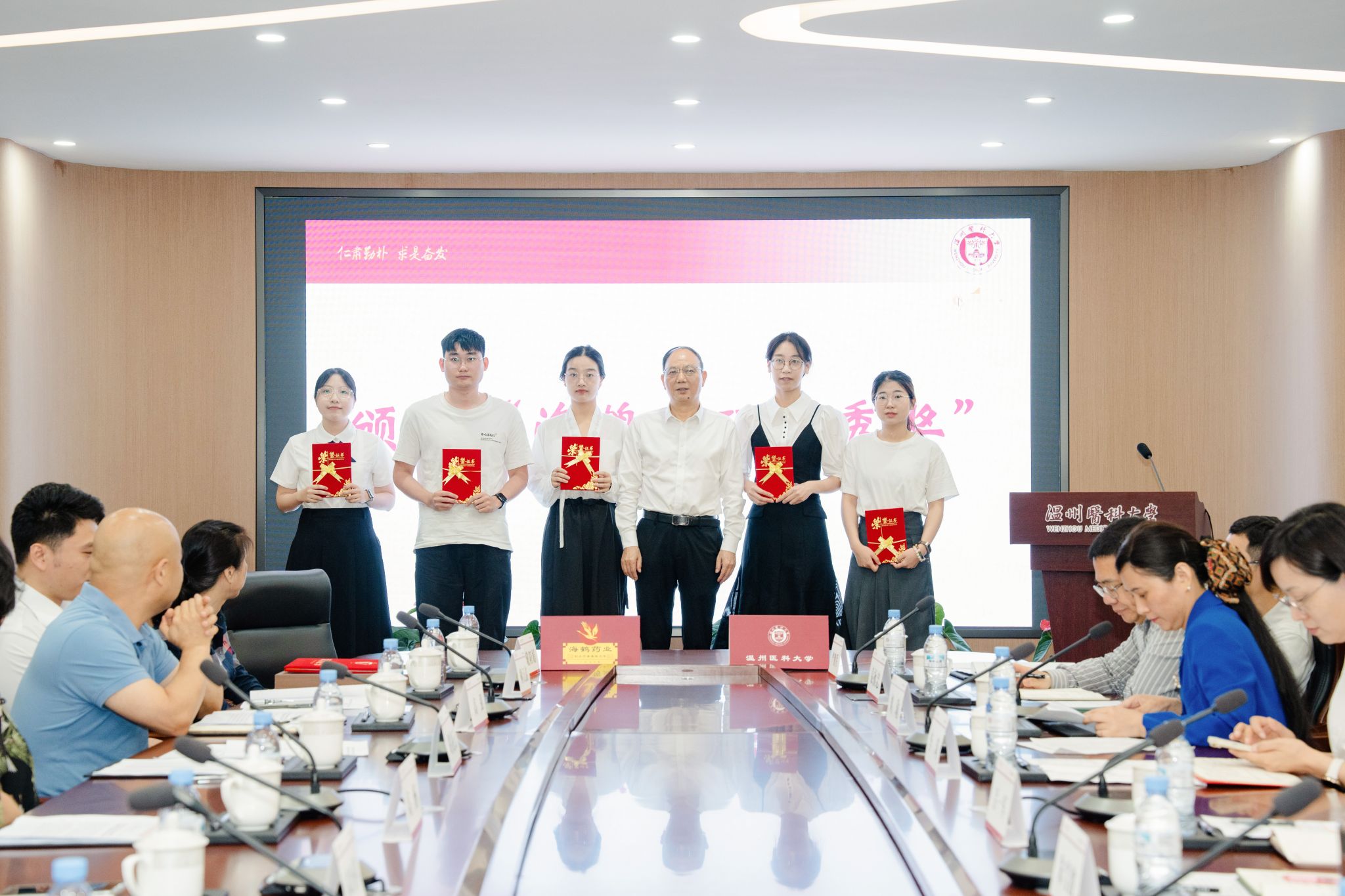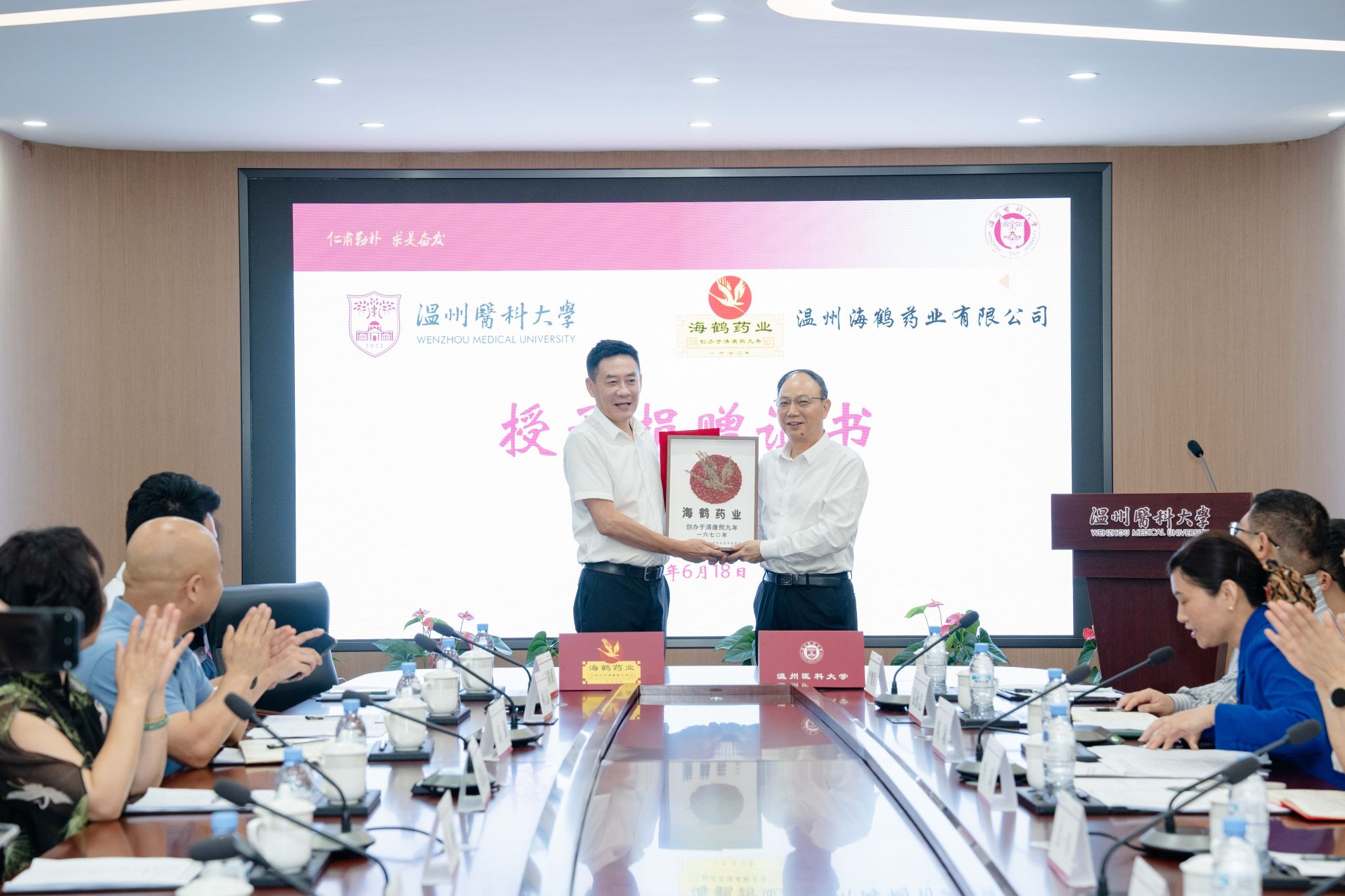 6月18日,楼凤 与温州海鹤药业有限公司在茶山校区三楼会议室举行合作框架协议签约捐赠仪式暨“海鹤奖学金”颁奖仪式。温州海鹤药业有限公司董事长高杨一行,校党委书记吕一军,党委委员、副校长朱雪波等出席此次仪式。会议由楼凤 党委书记刘瑜主持。海鹤药业有限公司、校相关职能部门、楼凤 相关负责人参加会议。
