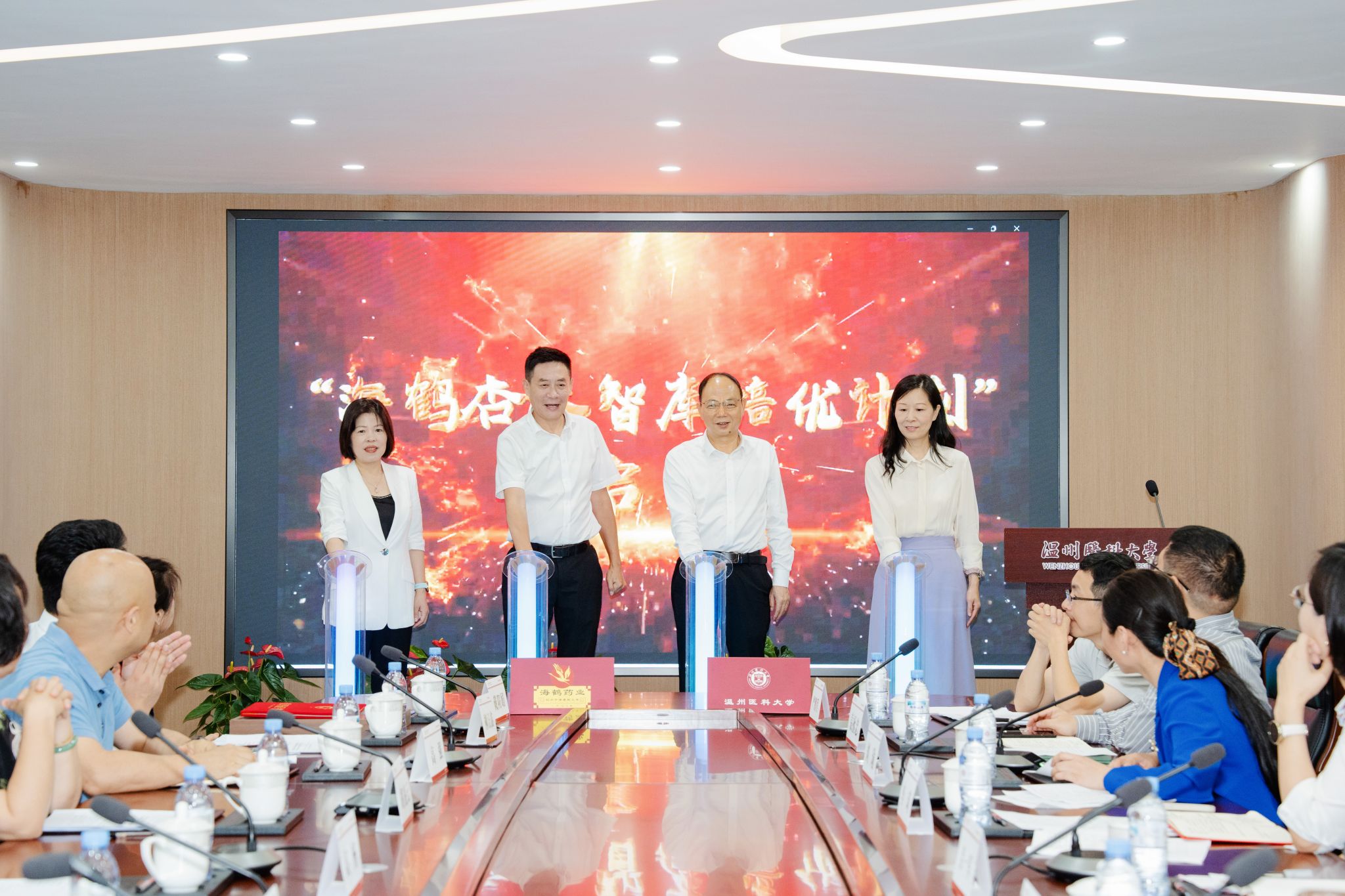 高杨、苏玲萍、吕一军、朱雪波代表双方正式启动“海鹤杏林智库培优计划”。“智库计划”旨在通过学院培育孵化教科研项目种子,助推学院教学科研水平,全面提升教师发展能力。