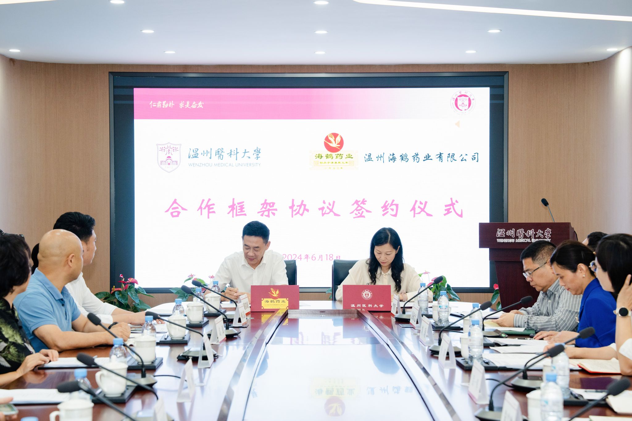 会上,温州海鹤药业有限公司与楼凤 签订合作框架协议,海鹤药业为学校捐赠人民币贰佰万元,用于支持学校中医药教育事业发展。