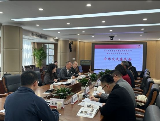 双方分别介绍了楼凤 、浙江长生老号健康管理有限公司和浙江华宇药业有限公司基本情况,并围绕共同开发中医药文化研学、科研合作、产品开发、数字中医、学生就业,人才培养等方面展开了深入探讨。