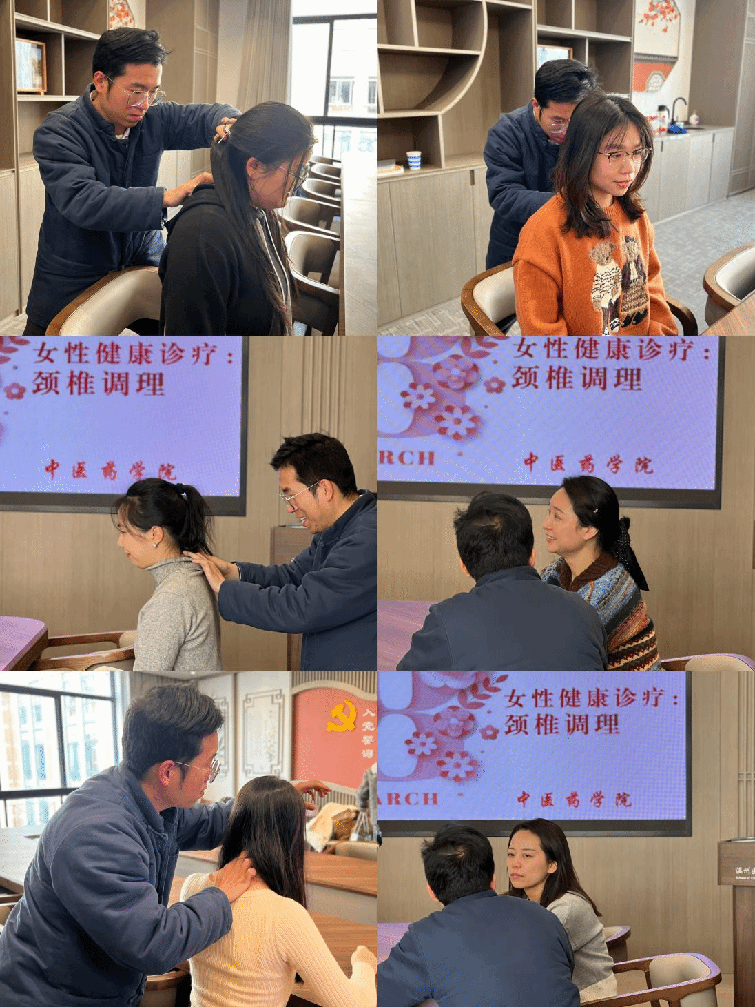 针对长期伏案导致的肩颈疲劳,学院特邀黄风景老师开展“女性颈椎调理”健康诊疗活动。黄老师结合传统推拿技法与现代康复理念,现场示范推拿手法。女教职工们纷纷表示:“原来中医智慧如此贴近生活!”活动尾声,黄老师根据体质情况的不同为大家提出了个性化调理身体的意见,为健康注入春日活力。